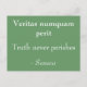 Um postal verde de menta escura com uma frase latina e a tradução em inglês. "A verdade nunca perde" é uma citação de Seneca, um escritor romano.