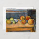 Um cartão-postal de arte fino com a pintura do artista poste-impressionista francês Paul Cézanne (1839-1906), intitulado "Ainda a vida com maçãs e peras" (1887). Um conjunto de peras verdes e maçãs frescas em uma mesa de madeira.