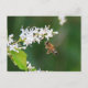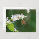 Uma abelha com pernas carregadas de pólen dirigindo-se a uma flor em um arbusto para coletar mais.