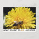 Cartão postal inspiracional com uma fotografia macro original de uma abelha de mel coletando pólen de uma flor de dandelion amarela em um primavera ensolarado. A citação motivacional, em preto e amarelo, diz "Não se esqueça de ser incrível".