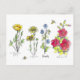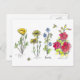 Um postal decorado com flores silvestres botânicas desenhadas a tinta preta com aquarela e abelhas zunindo por ali.