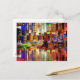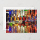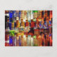 Este cartão postal colorido de abstrato de arte retrata filas de garrafas de licor refletindo a luz sobre uma superfície do contador de bares.