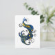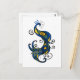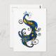 trabalho de arte decorativo de um pavão abstrato estilizado com muitos elementos ornamentais em cores azul, amarela e verde em um cartão postal.