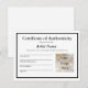 Modelo de Certificado de Autenticidade Personalizável para artistas a serem incluídos com as obras artísticas originais. Você pode personalizar qualquer um dos campos de texto e adicionar uma foto do seu logotipo de trabalho de arte ou empresa de arte.