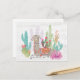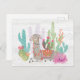 Uma aquarela macia com uma lhama a saltar entre os cactos. Artista: Mary Urban