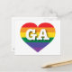 Este cartão postal apresenta um coração com um design de orgulho arco-íris e as letras GA. Além das listras, dentro do coração, estão as letras maiúsculas, brancas e negrito GA, a abreviatura oficial do estado da Geórgia, o estado de pêssego. O reverso da carta é vazio aguardando seu texto personalizado ou sentimentos sinceros. Mostre suas cores verdadeiras, apoie a igualdade do casamento e comemore a orgulho gay.