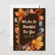 Nós somos muito gratos por você. Lindos cartões-postais de Ação de Graças castanhos escuros para uma empresa enviar aos clientes a sua gratidão durante a temporada de férias. Personalize com o nome da sua empresa dentro da folhagem de outono em aquarela de folhas laranja. Mensagem personalizada no verso para marketing de outono.