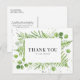 Cartão de agradecimento tema verde para o seu evento. Apresenta moldura de aquarela de samambaias e folhas de eucalipto. Personalize adicionando nomes, endereço de retorno e mensagem. Este cartão de agradecimento verde é perfeito para casamentos de verão, chás de bebê e muito mais.