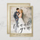 Agradeça aos convidados do casamento de forma sofisticada com este cartão postal personalizado de agradecimento com foto. Este modelo apresenta sua foto na capa com uma borda dourada e as palavras "Muito Obrigado" e os nomes dos noivos com a data do casamento. No verso, uma mensagem e assinatura personalizadas em um fundo dourado. Criado pela artista Susan Coffey.
