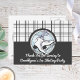 O design apresenta um par de patins de gelo sobre uma crista de floco de neve e um fundo com padrão tartan bege. Este elegante design de esportes de inverno serve como cartões-postais modernos e únicos para festa de aniversário com tema de patinação no gelo para crianças, saudações de Natal, ou qualquer outro evento especial.
