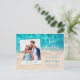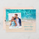 Este moderno cartão "Salvar a data" apresenta uma vista de topo da praia enquanto as ondas se rompem na costa. Uma foto enquadrada do casal engajado adiciona um toque pessoal. A design é perfeita para um casamento de Verão, um casamento de praia ou um casamento de destino. As cores são calorosas e calorosas.