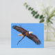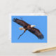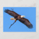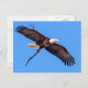 Uma águia fotografada com um bastão grande para adicionar ao seu ninho, contra um céu azul vívido.