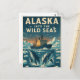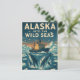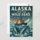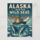 Retro travel poster of Alaska, USA. A powerful icebreaker ship cutting through frozen Arctic waters, chunks of ice drifting around. In the foreground, two majestic humpback whales breach dramatically from the ocean, water splashing high into the air.