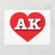 Este cartão-postal apresenta um coração vermelho vibrante contendo as letras maiúsculas brancas em negrito AK, a abreviação oficial do Alasca, a última fronteira. O reverso do cartão postal é vazio, aguardando seu texto personalizado ou sentimentos escritos à mão.