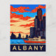 Cartaz de Albany. Moto no rio Hudson e arranha-céus atrás. Viagem postal em cores vibrantes.