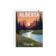 Celebrate the breathtaking wilderness of Alberta, Canada, with this vibrant vintage-style postcard. The design features a winding river flowing through lush greenery with pink wildflowers, set against a stunning backdrop of the Rocky Mountains at sunset. This classic travel poster artwork is perfect for nature lovers, campers, hikers, and anyone who appreciates Canadian scenery. Ideal for sending greetings, keeping as a souvenir, or framing as beautiful, rustic wall art.