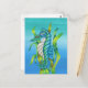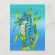Este cartão-postal tem uma criatura mágica oceânica que é um dragão-marinho ou cavalo-marinho em azul e verde com uma barriga branca e chifres brancos na cabeça. Sua cauda é envolta em algas marinhas em vários tons de verde sobre um fundo aquoso em tons de azul.