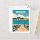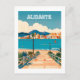 Uma ilustração vibrante e colorida de uma cena litorânea pitoresca em Alicante, Espanha. A imagem mostra uma praia arenosa que conduz a um claro oceano azul, com uma charmosa cidade costeira enfiada no pano de fundo de colinas rolantes. Os prédios coloridos e as palmeiras dão palmadas ao palco.