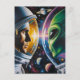 Alienígena e astronauta no espaço fazendo um olhar para baixo. Fundo de estrelas e planetas.