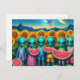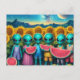 Um grupo de aliens com melancia posam em frente a um campo de girassol