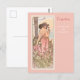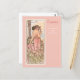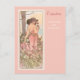 Um cartão postal de belas artes com a ilustração vintage de Alphonse Mucha, da série Flor (1898), que foi restaurada e melhorada digitalmente. Um retrato de uma mulher de vestido rosa cercado por um campo de cravos cor-de-rosa e brancos.