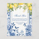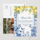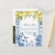 Evoque a elegância atemporal e o charme vibrante de um casamento em amarelo limão e azul marinho com nosso Cartão de Agradecimento de Casamento em Amarelo Limão e Azul Marinho. Este design encantador apresenta uma borda floral Chinoiserie azul marinho adornada com ramos de limões amarelos pintados à aguarela, flores de limão e folhas de limão, criando uma fusão deslumbrante de sofisticação clássica e capricho ensolarado.