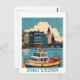 Uma ilustração vibrante e colorida de uma cena de praia em Amesterdã, Países Baixos. A imagem mostra uma praia arenosa com guarda-chuvas coloridos, palmeiras e um passeio de barco em direção ao oceano. Um veleiro é visível à distância, e o céu está cheio de nuvens brancas e fluffy. A atmosfera geral é alegre e convidativa.