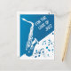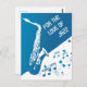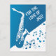 Este cartão-postal apresenta cores azuis-brancas dominantes, uma ilustração saxofônica plana, notas musicais, corações azuis e o texto padrão personalizável "pelo amor do jazz". É um design excelente para música e amantes de jazz!