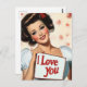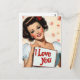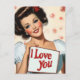 Uma ilustração vibrante no estilo pino-up clássico dos anos 1950. A imagem apresenta uma mulher glamourosa com curvas vintages, maquiagem ousada e um sorriso radiante. Ela segura uma placa com uma mensagem amorosa, "Eu te amo", colocada contra um pano de fundo de delicadas rosas rosa. A estética geral captura a vibração romântica e brincalhona da arte "pin-up" do século do médio.