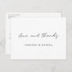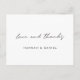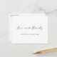 Este simples obrigado de casamento na moda que você faz no postal mostra 'amor e obrigados em preto em um roteiro quente e moderno em letras minúsculas. Este elemento do design não pode ser alterado. Você pode alterar a cor, a fonte ou o tamanho de qualquer outro texto. O tom padrão para o texto de nomes na parte frontal é preto e a cor padrão do texto na parte traseira é um tom de cinza. Colocamos um exemplo de texto no verso para que você substitua por sua mensagem. Mas, por favor, não se sintam restringidos por isto. Se você preferir fazer o vazio traseiro para poder escrever uma nota manuscrita em cada cartão, você pode fazer isso. Em todo o caso, certifique-se de que eliminamos o nosso texto de amostra! Não escolhemos uma cor padrão para o plano de fundo em nenhum dos lados. Em vez disso, o padrão é definido como transparente para permitir que a cor do papel sirva simplesmente como tom base. Você pode alterar isso selecionando uma cor nas ferramentas de edição, se quiser por um ou ambos os lados. Um design minimalista como este coloca o papel num foco mais nítido e convida-o a adicionar as suas próprias palavras escritas à mão, sejam as suas assinaturas ou uma mensagem também. Escolhemos preferencialmentes mattas que semirbrilho como a opção padrão de papel, pois ele é adequado para escrevendo sua própria mensagem e não borrão. Mas você pode mudar isso de acordo com seu estilo. Use as ferramentas de edição intuitivas e faça com que este simples obrigado de casamento moderno seja o único a fazer o seu postal com as ferramentas intuitivas de design e a sua inspiração!