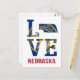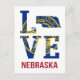 Amor de Nebraska. Nebraska em letras maiúsculas vermelhas com a palavra amada cheia com a bandeira estadual. A letra O apaixonada é a silhueta com o esboço do estado de Nebraska.