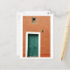 O nosso cartão-postal mostra uma fotografia da porta da frente de uma casinha em Culross, Fife, Escócia. As paredes são pintadas de laranja queimado e a porta é verde. A placa na parede data do prédio da casa para 1676. Adicionamos a famosa pintura de anjo cerebral do Raphael à pequena janela.