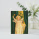Vintage illustration of a lovely angel with white feather wings and golden hair, ringing the bell for Christmas time. On the background behind the dark green curtains is a nostalgic Christmas tree with bright burning candles.
