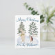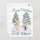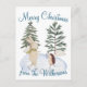 Este cartão de Natal ou feriado personalizado apresenta uma cena aquosa quente e confortável de inverno nevado. Dois pequenos e bonitinhos animais de floresta, um ouriço e coelho, estão patinando no gelo entre as árvores.