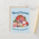 Este cartão postal de Natal personalizado apresenta uma ilustração de uma fazenda com cores agudas. Pequenos animais de fazenda estão vestidos com chapéus de Santa fora de uma fazenda rural. O fundo é uma cor azul clara.