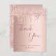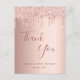 Um cartão de agradecimento para um aniversário de 100 anos. Uma cor de fundo metálica falsa rosa dourada. Com respingos de brilho falso, aparência de gota de tinta. Na frente, grande letra manuscrita cor de rosa dourado escuro e o texto: Obrigado, seu texto, título e uma data.