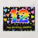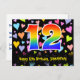 A frente deste emocionante, amoroso e divertido design de cartão postal temático de aniversário apresenta um grande número "12" com um padrão inspirado em gradiente de espectro de arco-íris. Também apresenta a mensagem "Feliz Aniversário de 12 anos", e um nome de destinatário personalizável. A frente também tem um padrão vibrante e colorido de formas de coração amorosas. A parte traseira apresenta uma mensagem de saudação de aniversário editável, ou talvez possa ser limpa e deixada em branco se uma mensagem for escrita à mão. Um cartão postal de aniversário personalizado como este pode ser uma maneira divertida de enviar uma mensagem celebrando o décimo segundo aniversário de alguém. Cartões postais como este também podem ser usados para convidar convidados para uma festa de aniversário realizada para alguém que está completando 12 anos de idade.