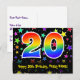 A frente deste design de cartão postal colorido, divertido e animado com tema de aniversário apresenta um grande número "20" com um padrão de gradiente de espectro de arco-íris, juntamente com a mensagem "Feliz Aniversário de 20 anos" e um nome de destinatário personalizado. A frente também tem um padrão de fundo vibrante e colorido com formas de estrelas de diferentes tamanhos. O verso apresenta uma mensagem de saudação de aniversário personalizável ou pode ser limpo e deixado em branco se uma mensagem for escrita à mão. Um cartão postal de aniversário personalizado como este pode ser uma maneira divertida de enviar uma mensagem comemorando o vigésimo aniversário de alguém. Cartões postais como este também podem ser usados para convidar convidados para uma festa de aniversário realizada para alguém que está completando 20 anos.