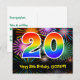 A frente deste emocionante, divertido e colorido design de cartão postal temático de aniversário apresenta um grande número "20" com um padrão inspirado no gradiente do espectro do arco-íris. Também apresenta a mensagem "Feliz 20º Aniversário," e um nome de destinatário personalizado. A frente também apresenta um padrão de fundo colorido e vibrante inspirado na aparência de fogos de artifício comemorativos estourando. O verso apresenta uma mensagem de aniversário personalizada, ou talvez possa ser limpo e deixado em branco se uma mensagem for escrita à mão. Um cartão postal de aniversário personalizável como este pode ser uma maneira divertida de enviar uma mensagem em celebração do vigésimo aniversário de alguém. Cartões postais como este também podem ser usados para convidar convidados para uma celebração de aniversário realizada para alguém que está completando 20 anos de idade.