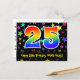 A frente deste design de cartão postal colorido, divertido e animado com tema de aniversário apresenta um grande número "25" com um padrão de gradiente de espectro de arco-íris. Também apresenta a mensagem "Feliz Aniversário de 25 anos," e um nome de destinatário personalizável. A frente também tem um padrão colorido e vibrante de formas de estrelas. A parte traseira apresenta uma mensagem de saudação de aniversário editável, ou talvez possa ser limpa e deixada em branco se uma mensagem for escrita à mão. Um cartão postal de aniversário personalizado como este pode ser uma maneira divertida de enviar uma mensagem em celebração do vigésimo quinto aniversário de alguém. Cartões postais como este também podem ser usados para convidar convidados para uma festa de aniversário realizada para alguém que está completando 25 anos.