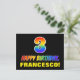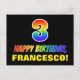 A frente deste design de cartão postal colorido, alegre e divertido aniversário com tema de aniversário apresenta um grande número "3" e a mensagem "FELIZ BIRTHDAY", ambas coloridas com um padrão inspirado no gradiente do espectro do arco-íris, juntamente com um nome de destinatário ousado amarelo editável. A frente também apresenta um simples fundo preto. A parte de trás do cartão postal tem uma mensagem de saudação de aniversário personalizável, ou talvez pudesse ser apagada e deixada a vazio se uma mensagem fosse escrita manualmente. Um cartão postal de aniversário personalizável como este pode ser uma maneira divertida de reconhecer o terceiro aniversário de alguém. [~Z0000474]
