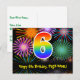 A frente deste design de cartão postal de aniversário emocionante, colorido e divertido apresenta um grande número "6" com um padrão de gradiente de espectro de arco-íris. Também apresenta a mensagem "Feliz Aniversário de 6 anos," e um nome de destinatário personalizável. A frente também apresenta um padrão de fundo colorido e vibrante inspirado na aparência de fogos de artifício comemorativos estourando. A parte traseira apresenta uma mensagem de saudação de aniversário personalizada ou pode ser limpada e deixada em branco se uma mensagem for escrita à mão. Um cartão postal de aniversário personalizável como este pode ser uma maneira divertida de reconhecer o sexto aniversário de alguém. Cartões postais como este também podem ser usados para convidar convidados para uma festa de aniversário realizada para alguém que está completando 6 anos de idade.