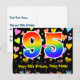 A frente deste divertido, emocionante e colorido design de cartão postal temático de aniversário apresenta um grande número "95" com um padrão inspirado em gradiente de espectro de arco-íris. Também apresenta a mensagem "Feliz Aniversário de 95 anos," e um nome de destinatário personalizado. A frente também apresenta um padrão colorido e vibrante de formas de coração amorosas. A parte de trás apresenta uma mensagem de aniversário personalizada, ou talvez possa ser limpada e deixada em branco se uma mensagem for escrita à mão. Um cartão postal de aniversário personalizado como este pode ser uma maneira divertida de celebrar o aniversário de noventa e cinco anos de alguém. Cartões postais como este também podem ser usados para convidar convidados para uma celebração de aniversário ou festa sendo realizada para alguém que está completando 95 anos de idade.