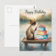 Celebre um aniversário ousado e elegante com esta ilustração em aquarela glamorosa de um gato siamês feroz e sofisticado vestido com um traje de pesca chique. Ela está no cais em uma pose confiante de poder, segurando seus três peixes troféu com atitude. Equipamentos de pesca de luxo a rodeiam, junto com um pequeno e elegante bolo de aniversário coberto com uma vela dourada para dar um toque de aniversário.