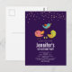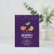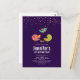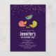 Convite de aniversário de cartão postal com um trio de pássaros fofos e caprichosos desenhados à mão. 2 dos pássaros estão juntos com algumas pequenas árvores de pinheiro verdes entre os pés. Outro pássaro azul está voando entre eles. Definido em um fundo roxo. Imagem de confete rosa-dourado falso no topo.