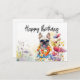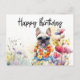 Este cartão postal de aniversário apresenta um Bulldog Francês em um campo de flores. O cão está cercado por flores coloridas, com uma mensagem de aniversário escrita em caligrafia