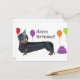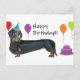 Este adorável Dachshund se vestiu especialmente para a ocasião para desejar um Feliz Aniversário ao amante de Dachshund na sua vida! Um dachshund preto e marrom em um chapéu de festa. Balões ao seu redor e um bolo aos seus pés.