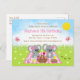 Este convite de aniversário fofo e caprichoso apresenta ursos adoráveis fazendo um piquenique em uma toalha xadrez rosa com guloseimas como mel, melancia, geleia de morango, limonada e torta. Ao fundo, há um céu azul brilhante e sol, borboletas e margaridas. O texto combina fontes decorativas e serifadas para uma aparência elegante e moderna. Isso é perfeito para uma festa de aniversário de primavera ou verão.