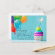 Deseje Feliz Aniversário aos seus alunos com este cartão postal personalizado. Bolo de aniversário com balões e letra cursiva e moderna. Verso do cartão postal em branco para escrever uma nota.