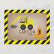 Aniversário com tema de construção com ilustração de uma escavadeira amarela e cone laranja com borda amarela e preta.